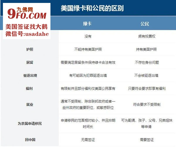 了解清楚了美国公民拥有的基本权利,接下来咱们进入正题,聊聊美国公民和绿卡持有者到底在这些权利面前,有没有区别?下面,大鹤让大家先来看张对比图: