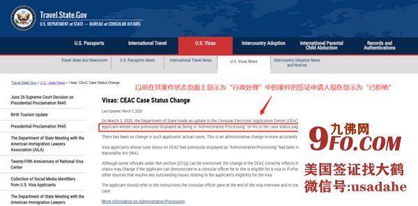 这个改变要追溯回2020年3月5日,当天美国国务院的网站已就CEAC案件状态变更发出了公告:以前在其案件状态页面上显示为“行政处理”中的案件的签证申请人现在显示为“已拒绝”。