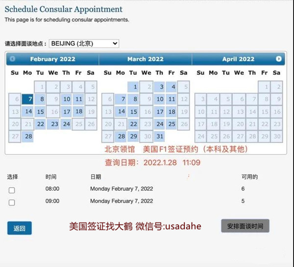 北京领馆:美国F1签证(研究生/博士):2022年2月7日