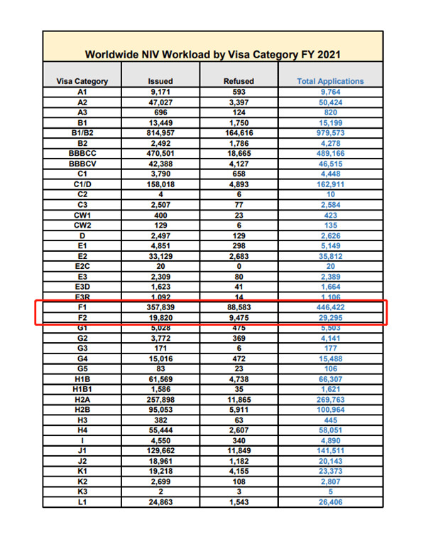 美国对赴美国留学签证通过率还挺好的,也比疫情之前低一些。根据2021年美国的官方数据,美国对全球所有国家总计审核F1留学签证446,442,批准签证357,839个,拒签88,583个,整体签证通过率约为80%。