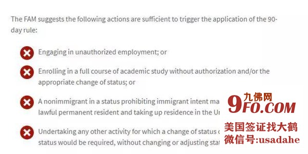 美国签证找大鹤认为:简单来说,就是拿着美国非移民签证的人(尤其是B1签证和B2签证)在每次入境美国后的90天内,不能做出导致身份发生改变的事情。例如说,与美国公民或永久居民结婚,工作,将孩子送往公立学校上学,签长期房租,买房,签订手机合同等。