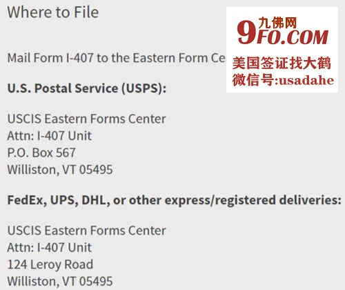 美国签证找大鹤一般建议申请人附上一份 Cover Letter,解释理由和文件材料。 放弃美国绿卡I-407申请目前需要邮寄到下面的地址: