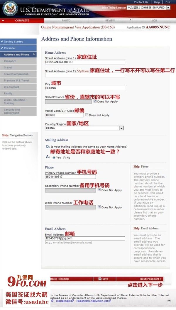 ②在美停留地址,建议在网上上找一个当地的酒店填写,酒店名称、地址、邮编、电话都要记下来,后边儿还会用到;