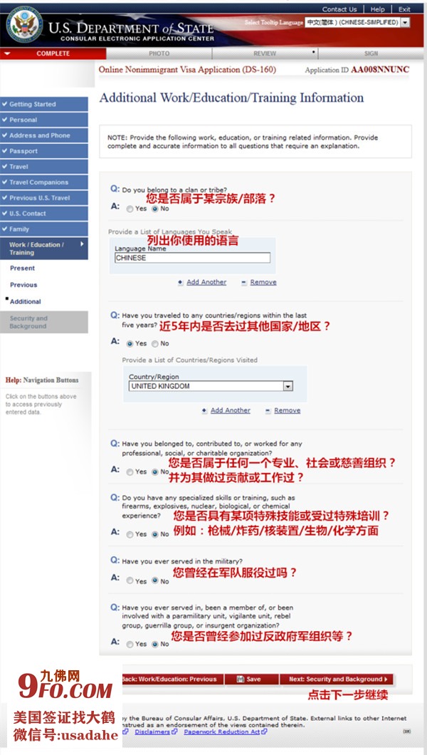第28页,美签大鹤 DS-160检查工作/教育信息;