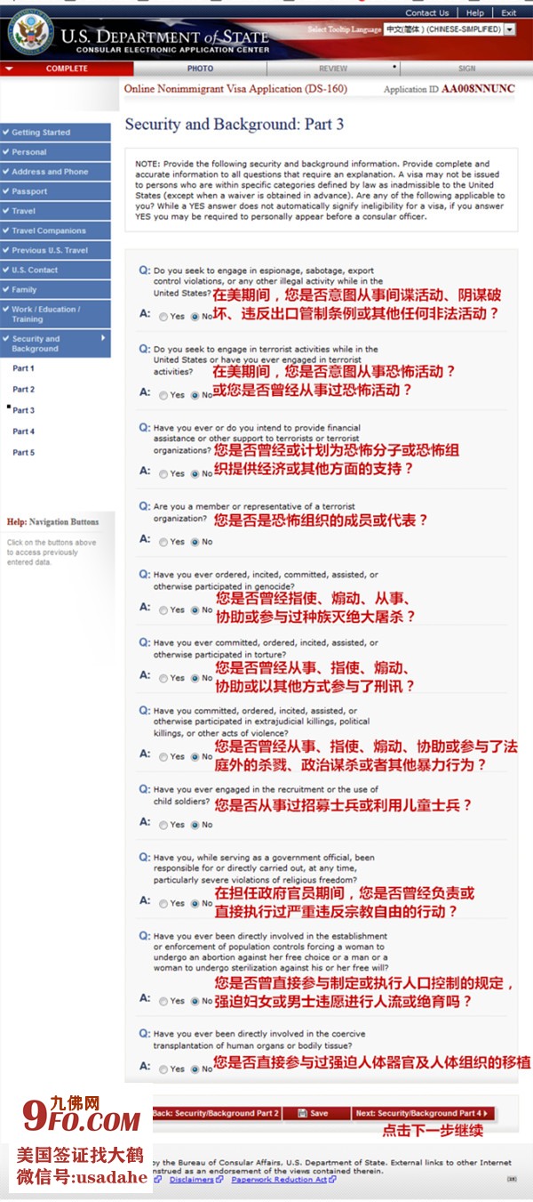 第29页,美签大鹤 DS-160检查安全/背景信息;